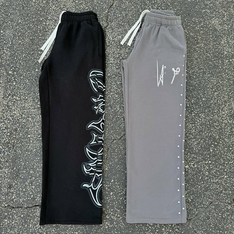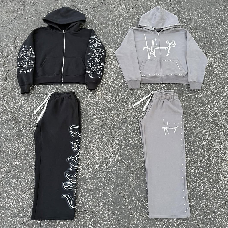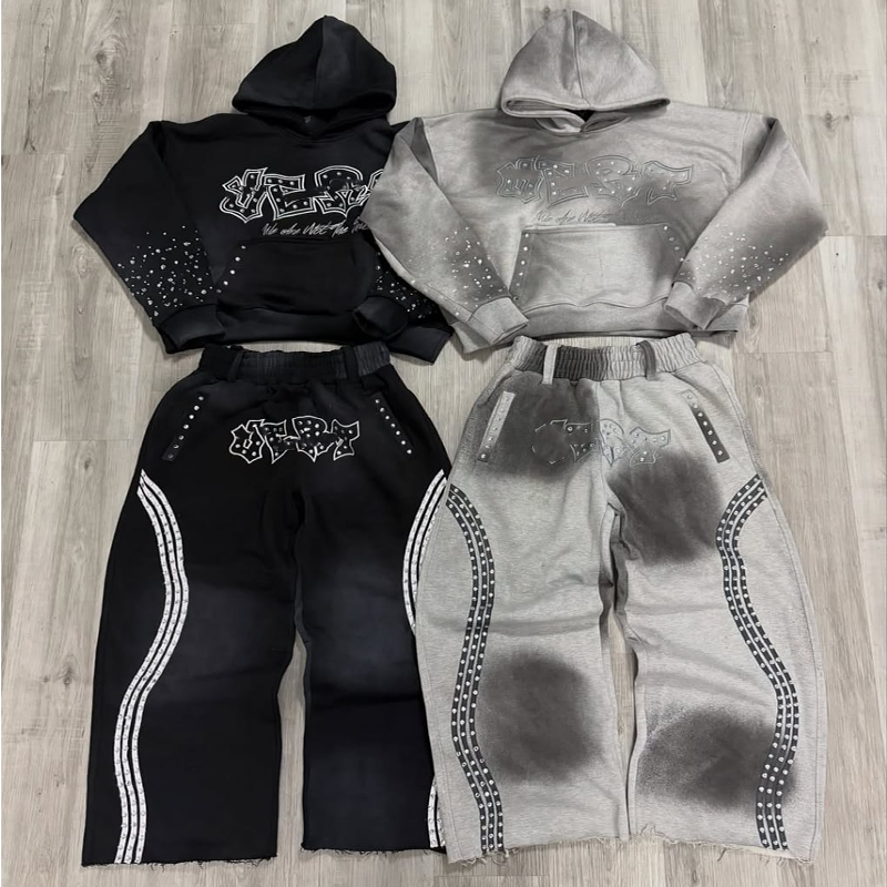 Custom Unisex Printing embroidery Men Flared Sweatpants and Hoodie Set Two Pieces Rhinestone Sweat suit French Terry Tracksuit