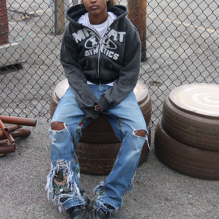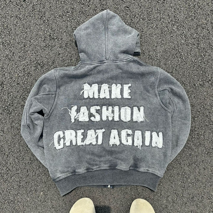 Custom Vintage Stone Washed Applique Patchwork Embroidery Breathable Heavyweight Cotton Summer Grey Long Zip Distressed Hoodie