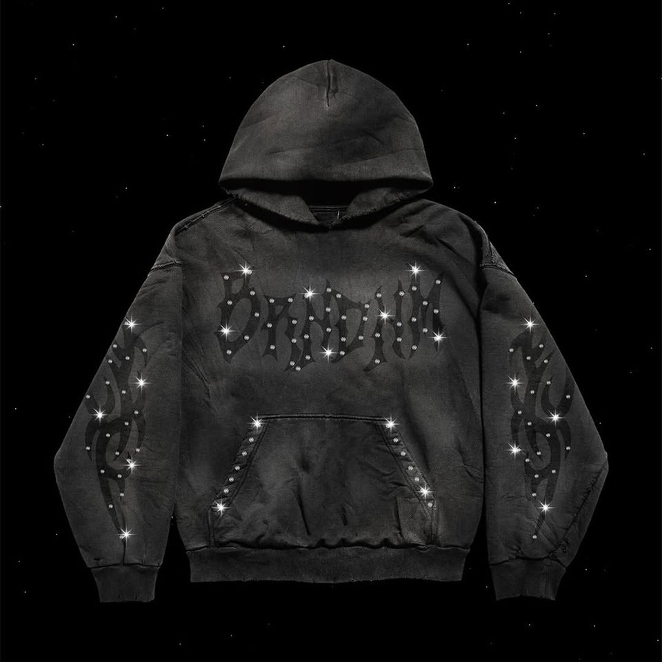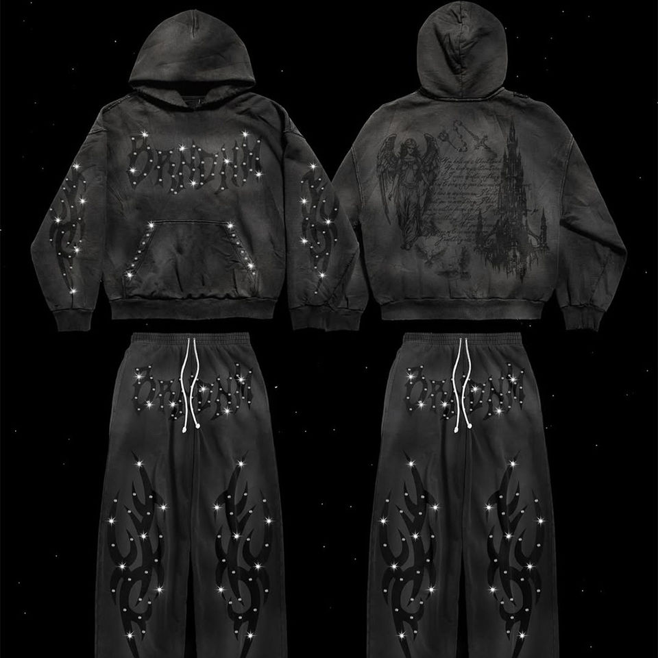 Custom Vintage Streetwear Hoodie Sweatpants 2 Piece Set Acid Washed 100% Cotton Joggers Sweat Pant Tracksuits for Men Rhinestone