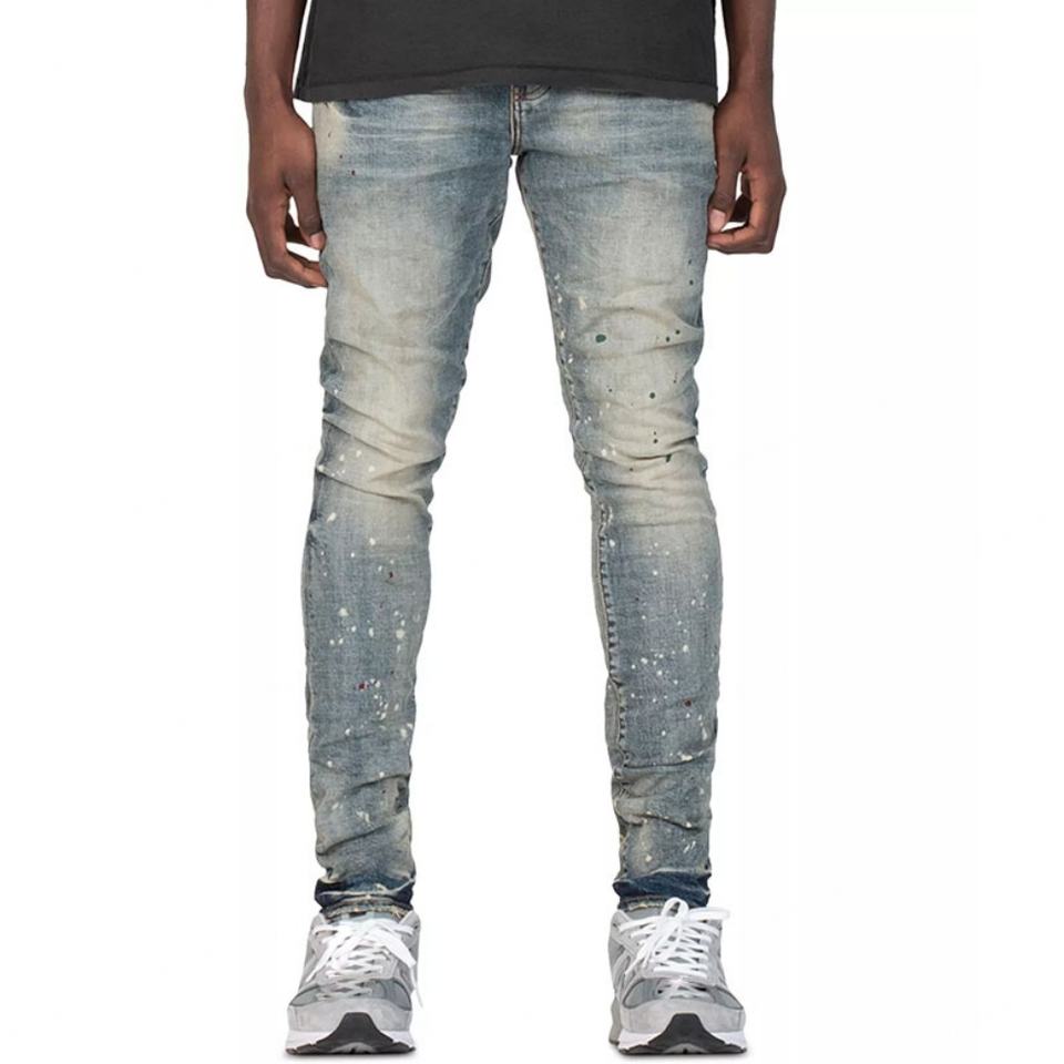 Custom Vintage Washed Slim Fit Jeans Light Blue Faded Denim Trousers Splatter Printed Indigo Jeans for Men