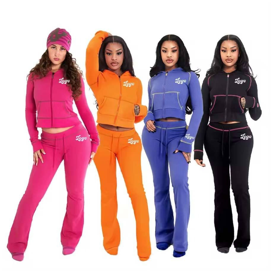 Custom Waffle Knit Sets Women Thermal Zipper Hoodie Jacket and Flared Pants Tracksuit Womens 2 Piece Sets