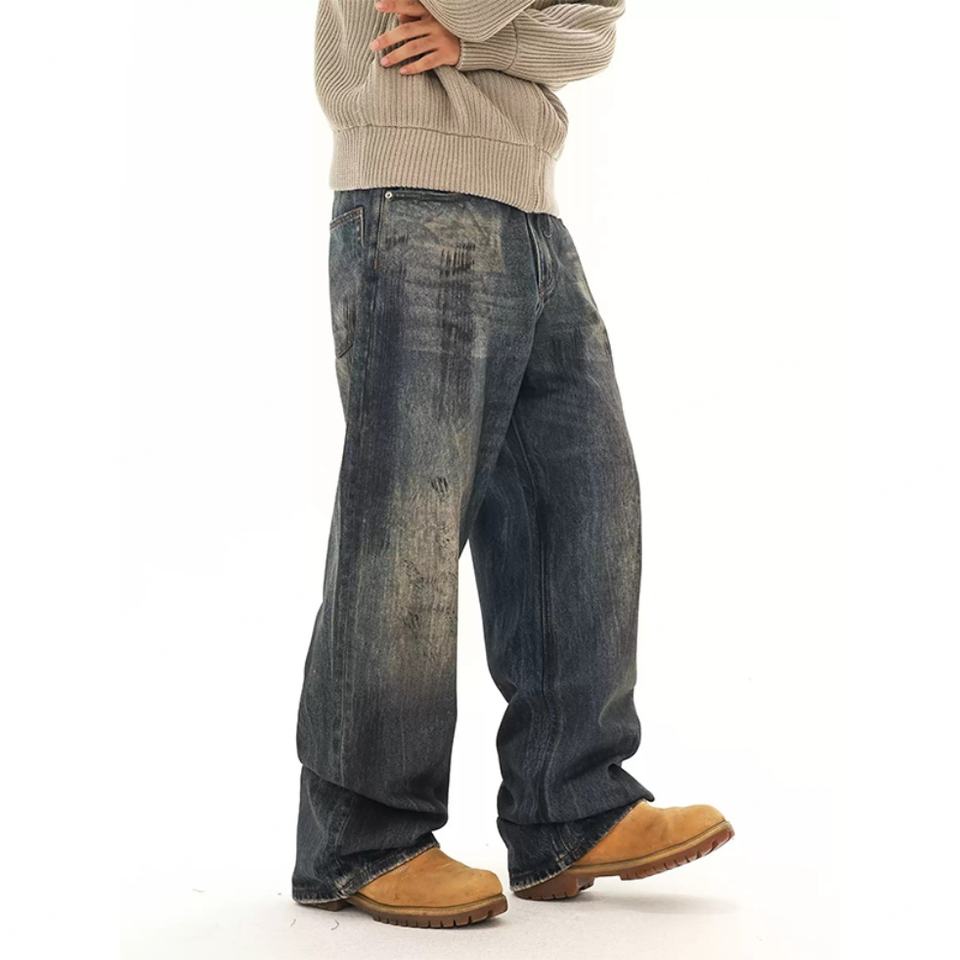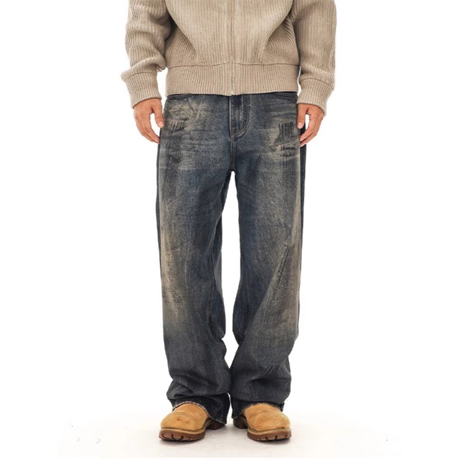 Custom Washed High Quality Cotton Distressed Jeans for Men Vintage Streetwear Straight Fit Baggy Trousers Men's Denim Pants