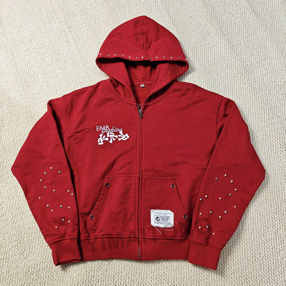 Custom Washed Red Hoodie Distressed Embroidery Cotton French Terry Gemstone Pearls Oversized Boxy Zip Up Hoodies for Men