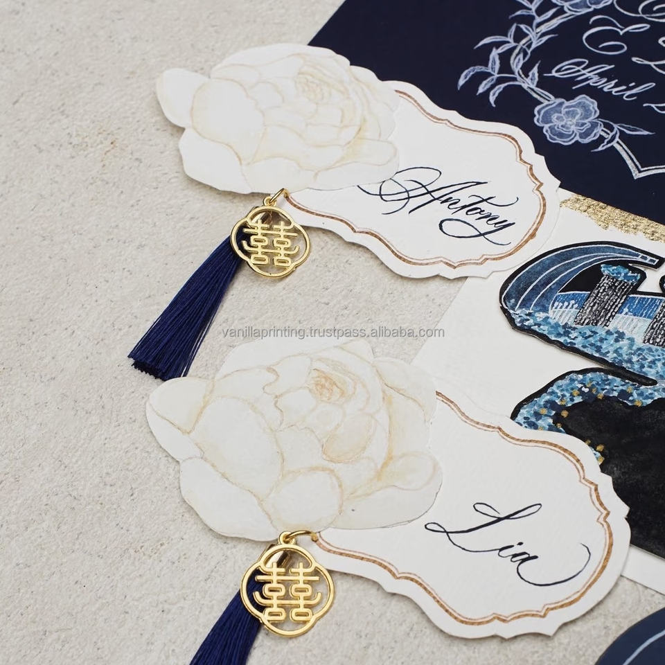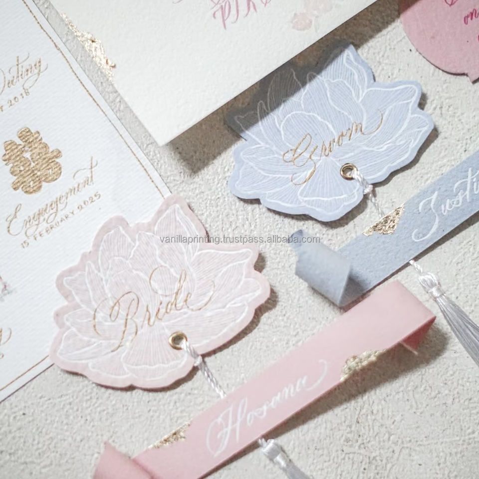 Custom Wedding Greeting Card with Ribbon Cotton Paper Offset Printing & Hot Stamping Elegant Design with Name Tag