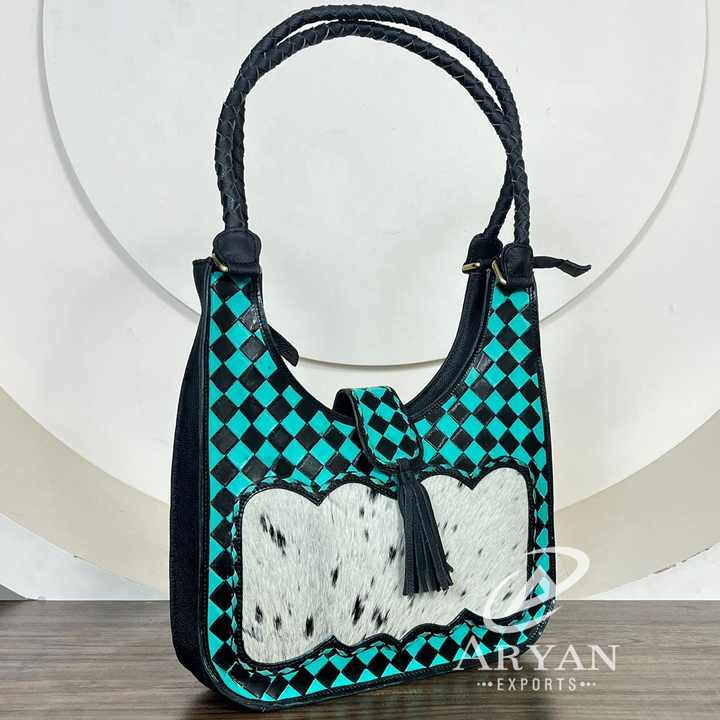 Custom Western Hand Tooled Cowhide Leather Handbag Turquoise & Black Checker Shoulder Bag Women's Fashion Tote Purse with Tassel