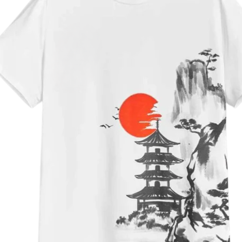 Custom White Asian Landscape Graphic T Shirt Red Sun Pagoda Mountain Art Print Unisex Soft Cotton Vintage Style Streetwear OEM