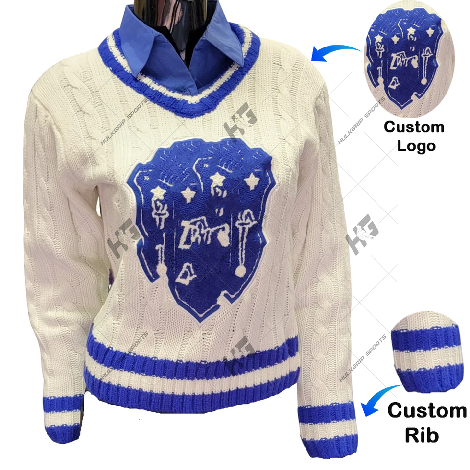 Custom White & Blue Stripe ZPB Sorority V Neck Cable Knit Sweater Thin Embroidered Logo on Front with Decoration