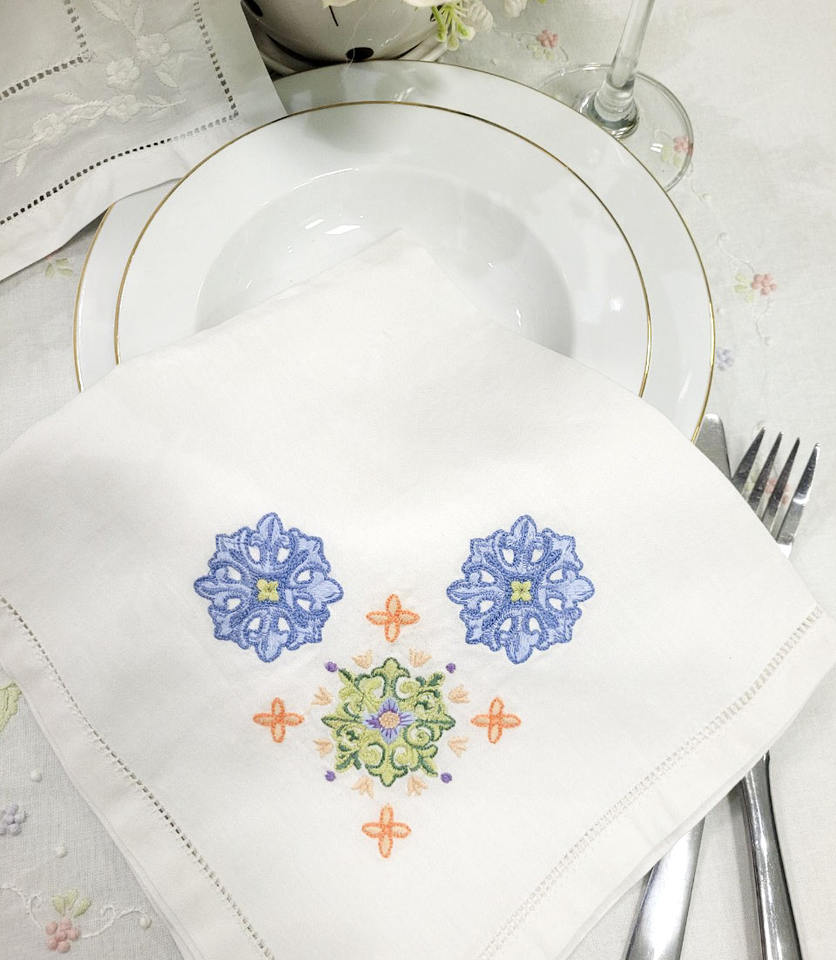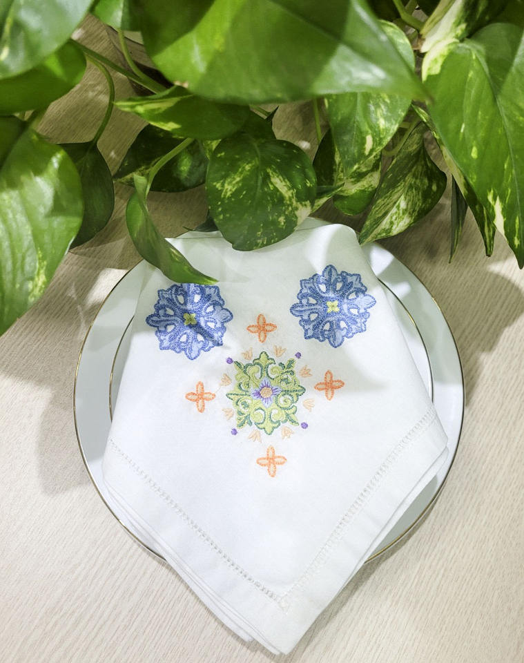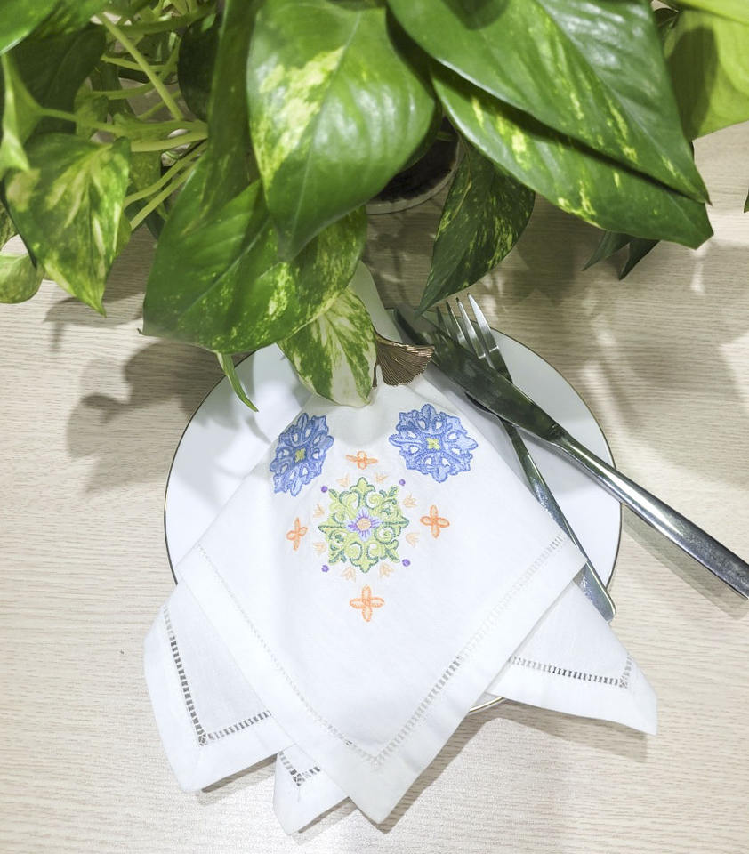 Custom White Cotton Dinner Napkin Classic Flower Embroidered Hemstitch Elegant Table Linens for Home Hotel or Events