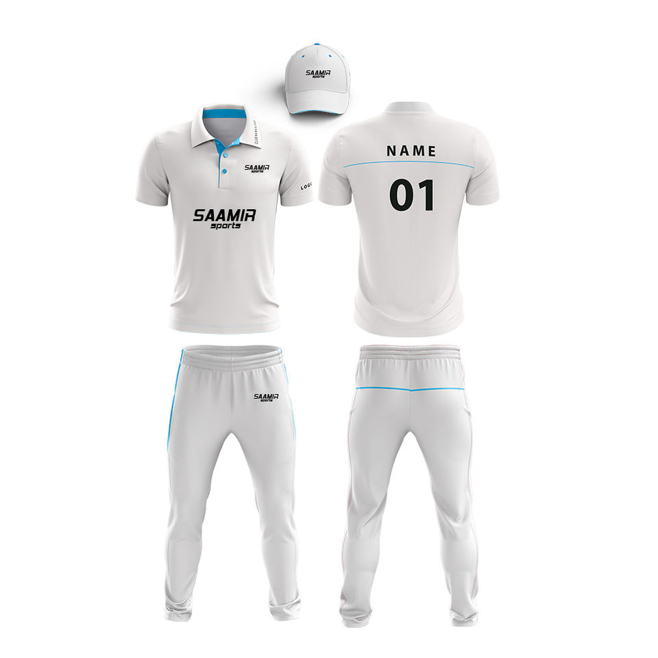 Custom White Cricket Uniform Kit with Custom Design and Logo Tshirt and Trouser in Unique Colors