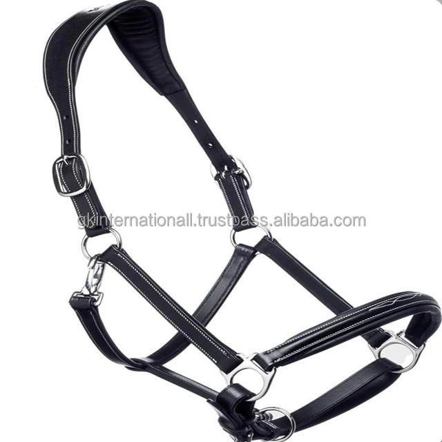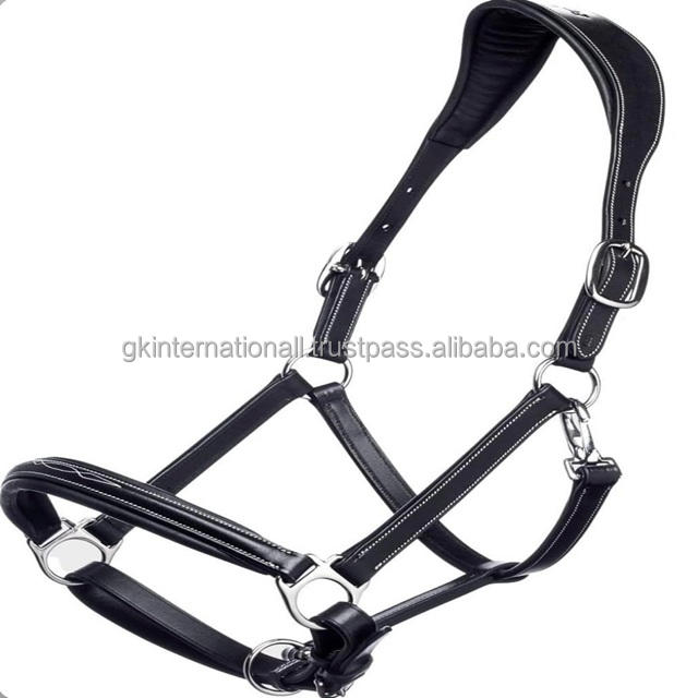 Custom White Stitching and Ultra Soft Padding Black Premium Leather Horse halter with solid adjustable brass accessories halter