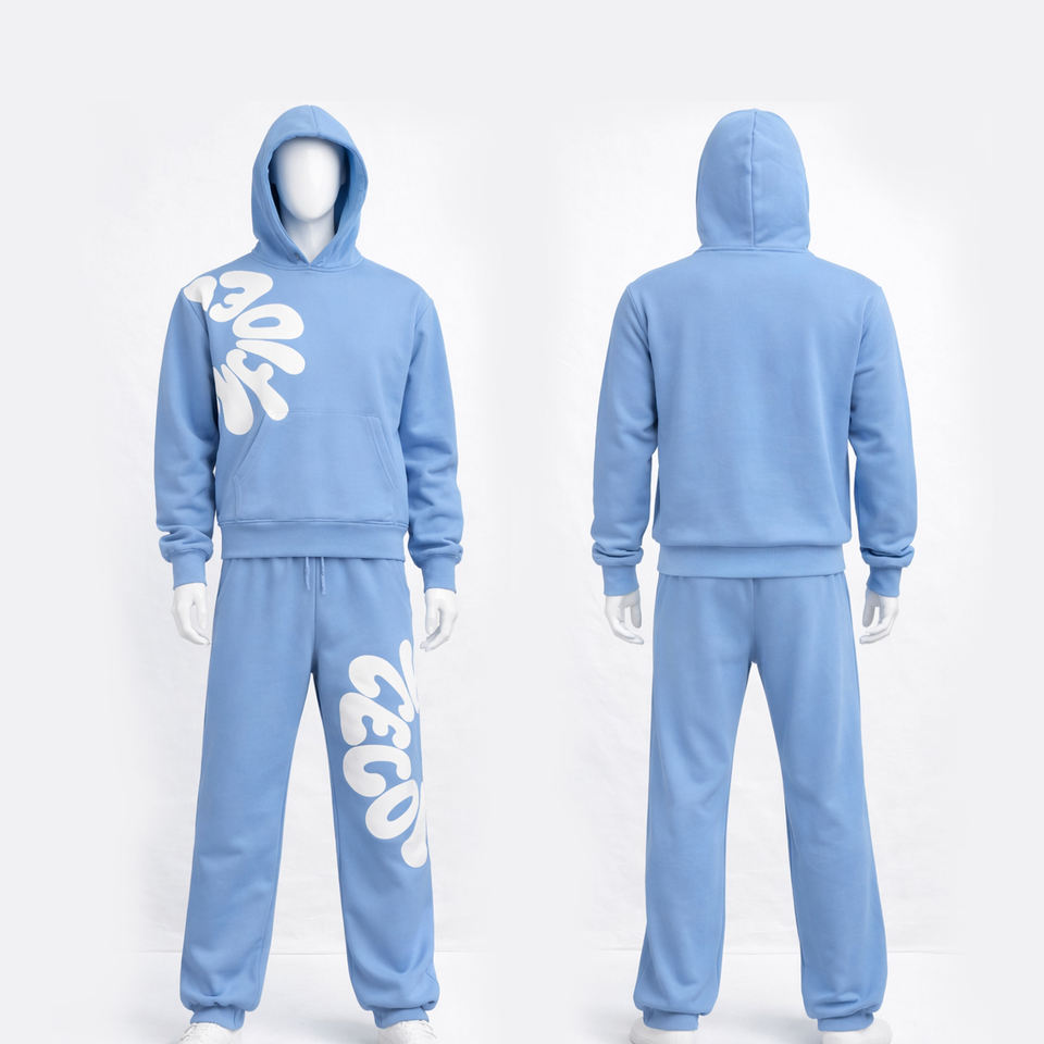 Custom Wholesale 2026 Mens Sky Blue Fleece Tracksuit Set Hoodie & Joggers Two-Piece Casual Streetwear Outfit
