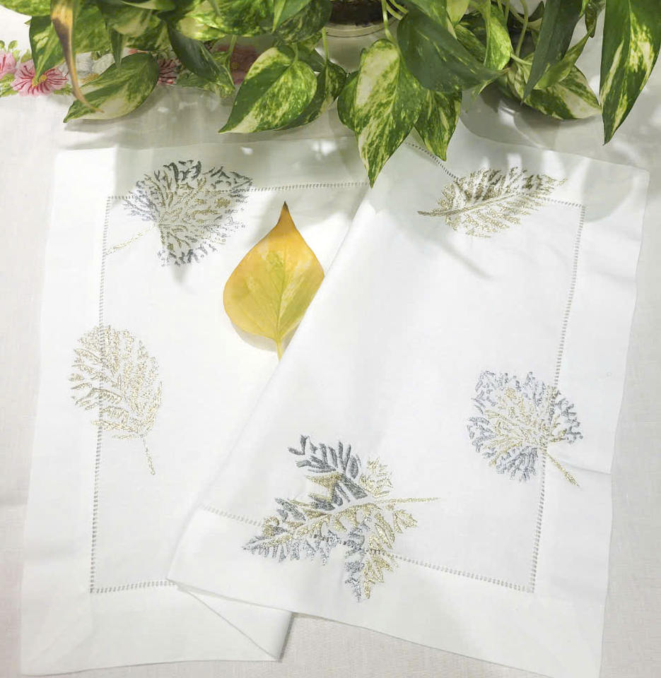Custom Wholesale Embroidered Gold& Silver Leaf Placemat& Napkin Set White Cotton Hemstitch Mats for Home Restaurants Events