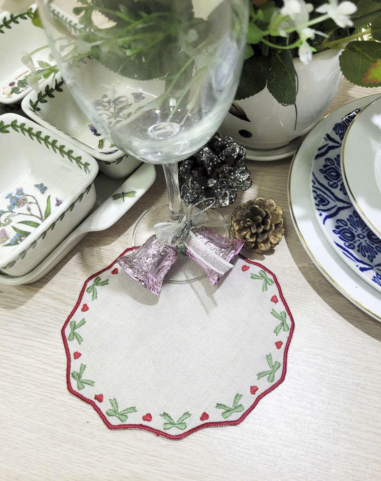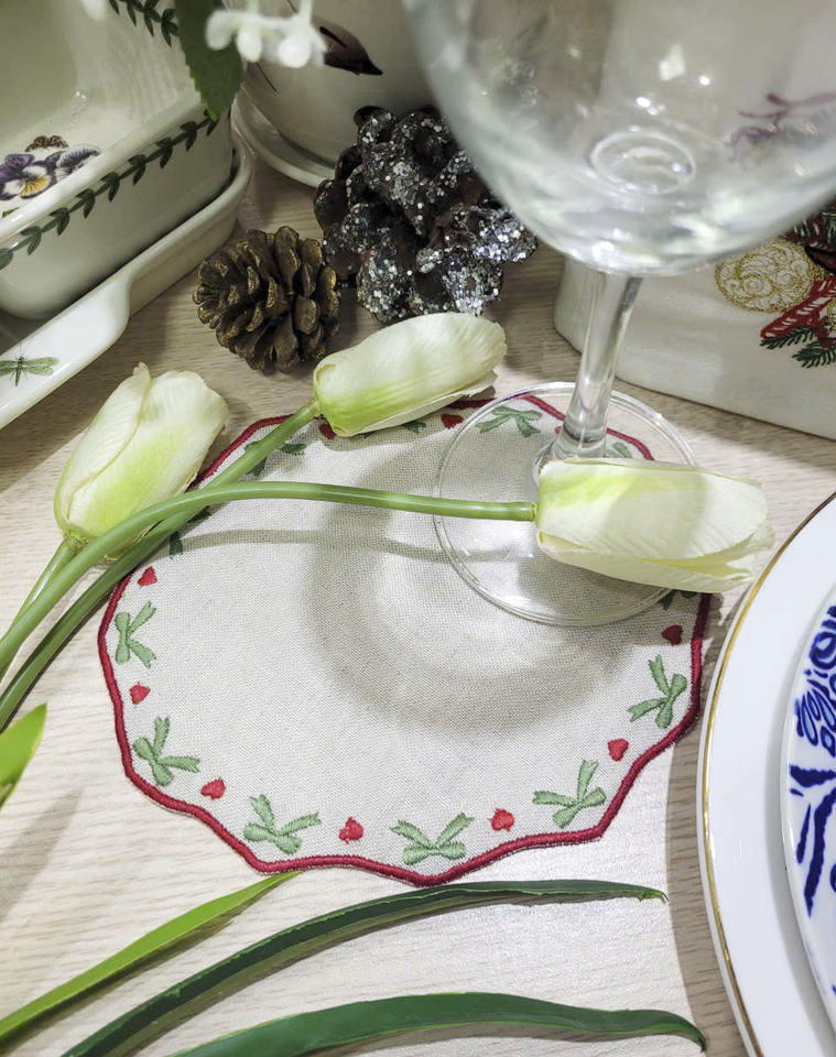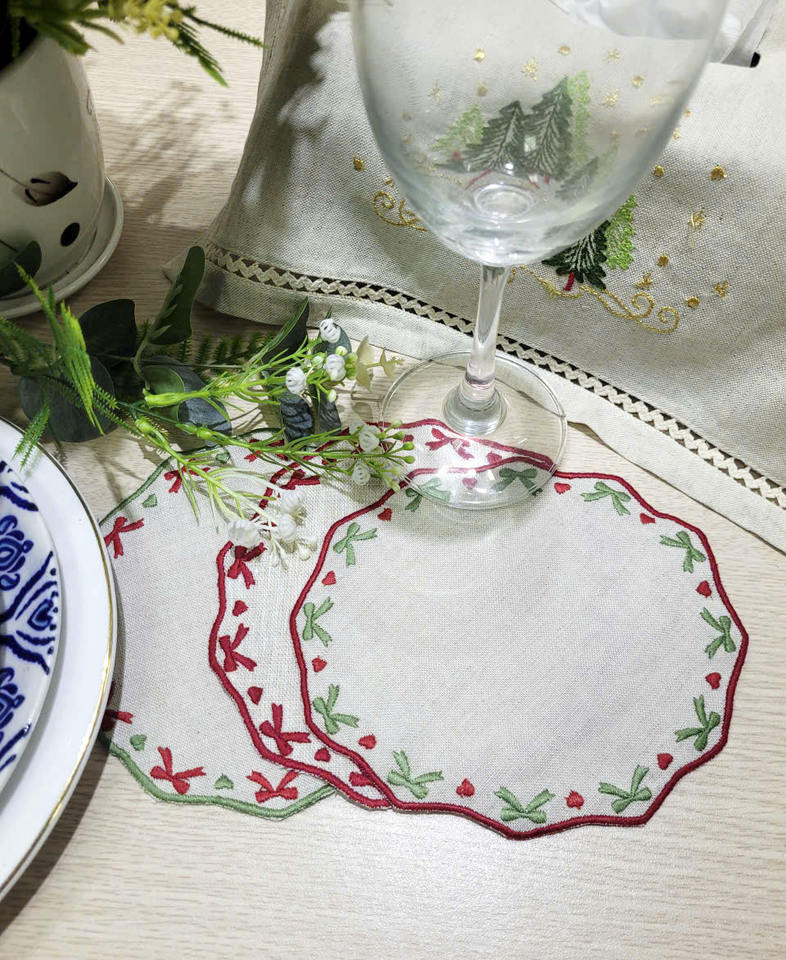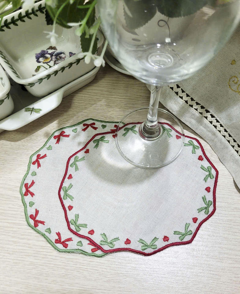 Custom Wholesale Embroidered Green Bow Round Cocktail Napkin Red Scallop Boarder Natural Linen Coaster Reusable Home Events Bars