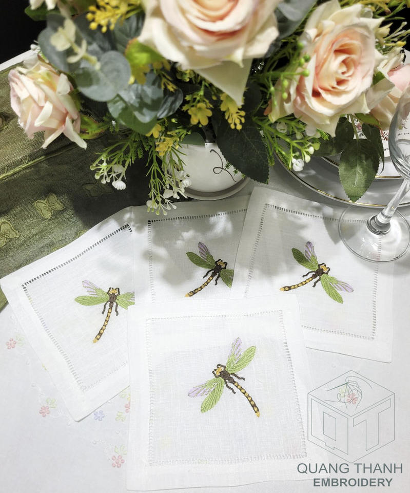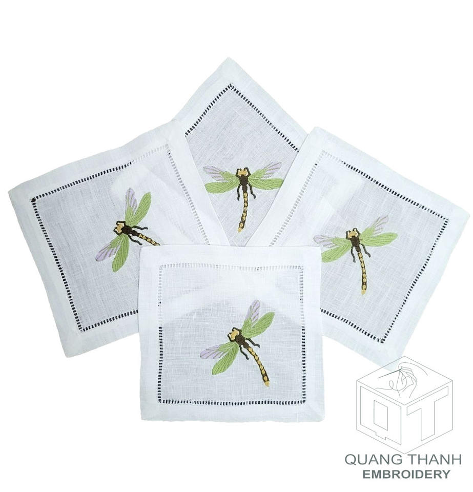 Custom Wholesale Embroidery Dragonflyr Cocktail Napkins Hemstitch Cocktail Napkin 100%White Linen for Home Hotel Bar Events
