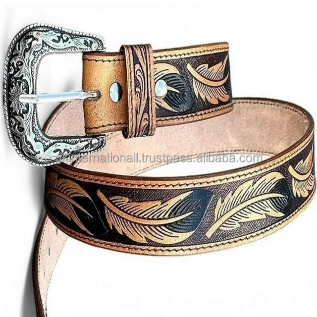 Custom Wholesale Leaf Design Embossed Men's Fashion Western Leather Tooling Belt with Floral Engraved Brass Buckle