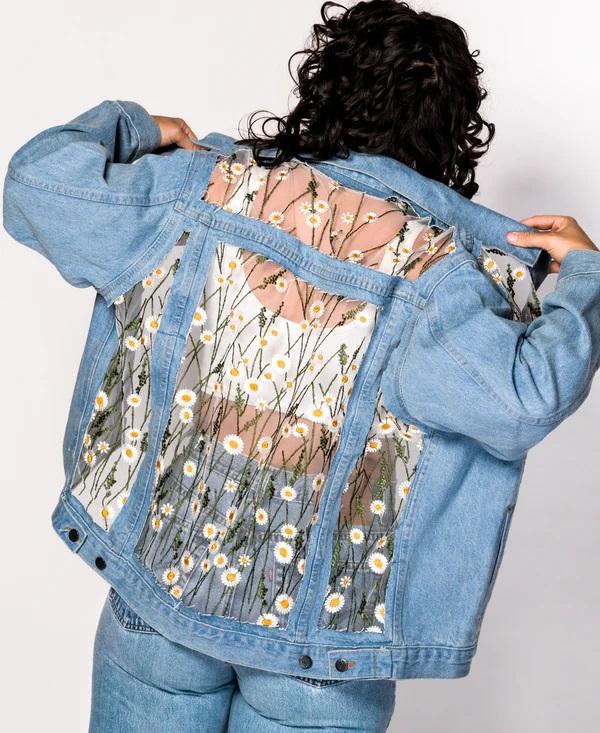 Custom Wholesale Solid Jean Jacket Hollow Out Lace Patchwork Flare Sleeve Plus Size Shacket Distressed Denim Jackets for Women