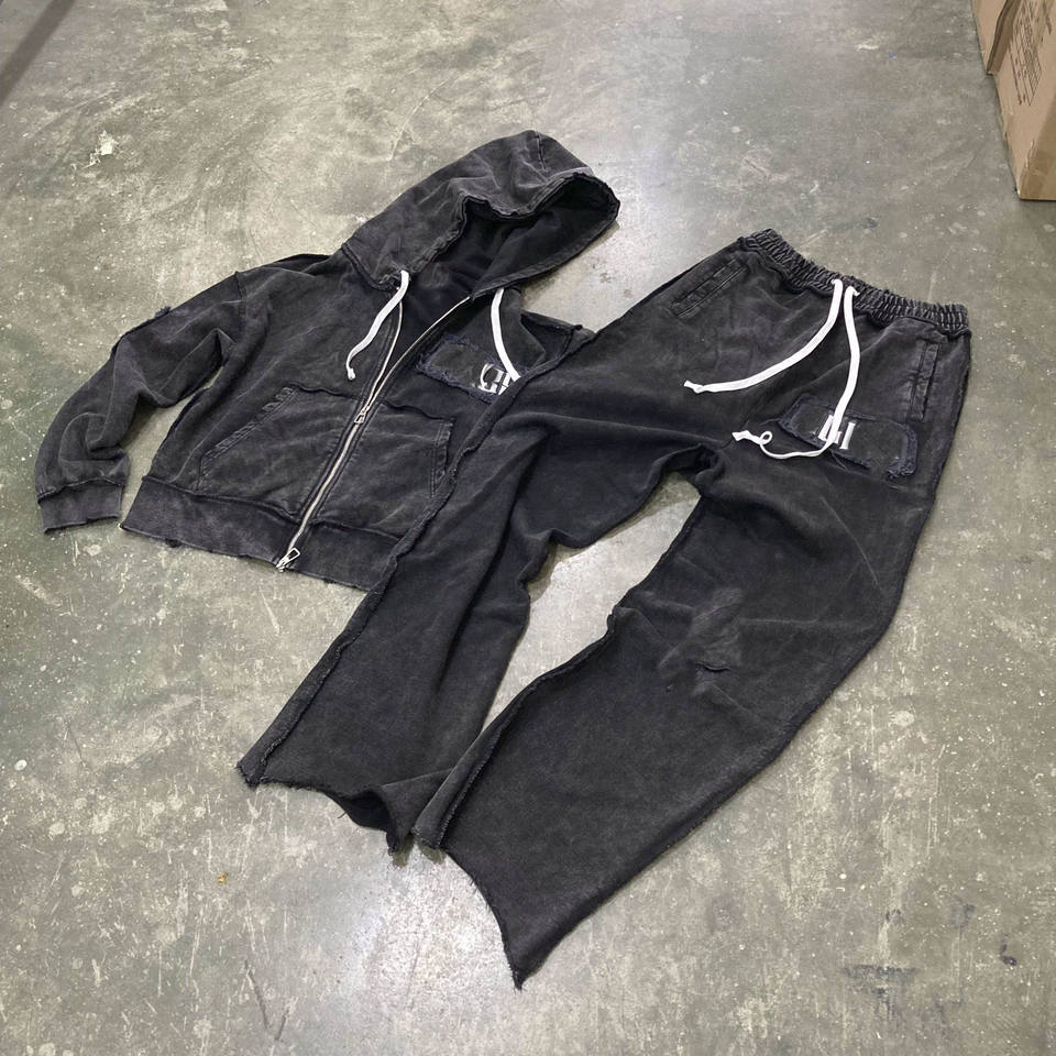 Custom Wide Leg Sweatpants and Joggers Hoodie Sets Sun Faded Embroidered Hoodie Sets Acid Wash Vintage Zip Hoodies Sets for Men