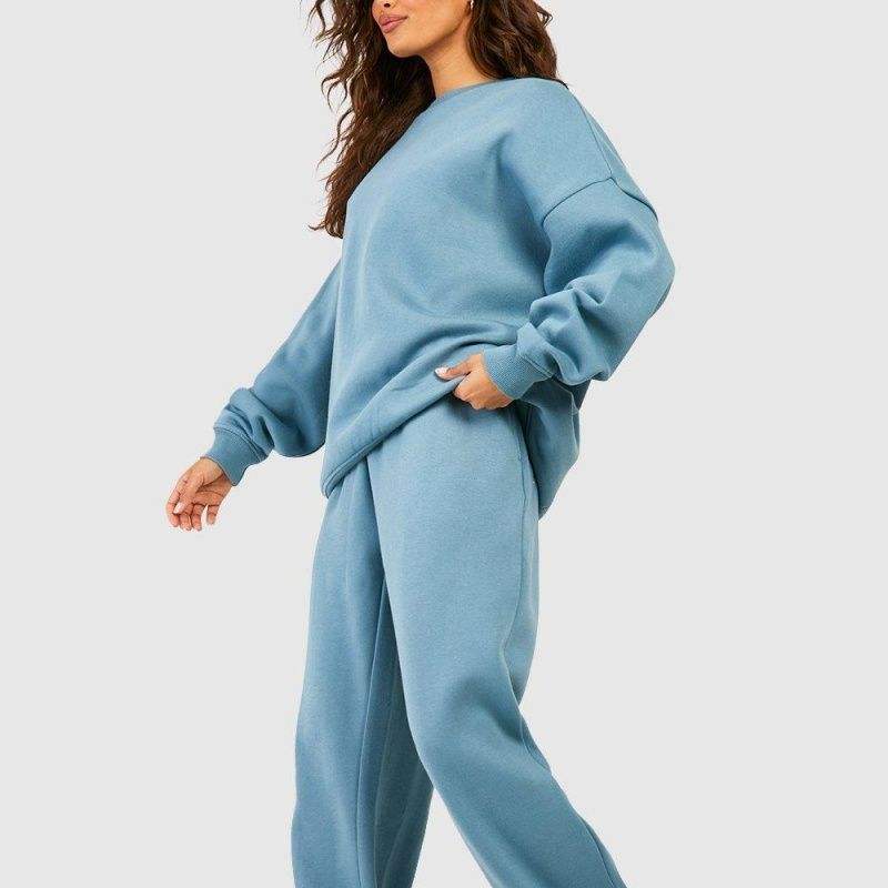 Custom Winter 100% Cotton Women Gym Sweatsuit Set Fleece Oversized Crewneck Sweatshirt and Wide Leg Jogger Sets Women Tracksuit