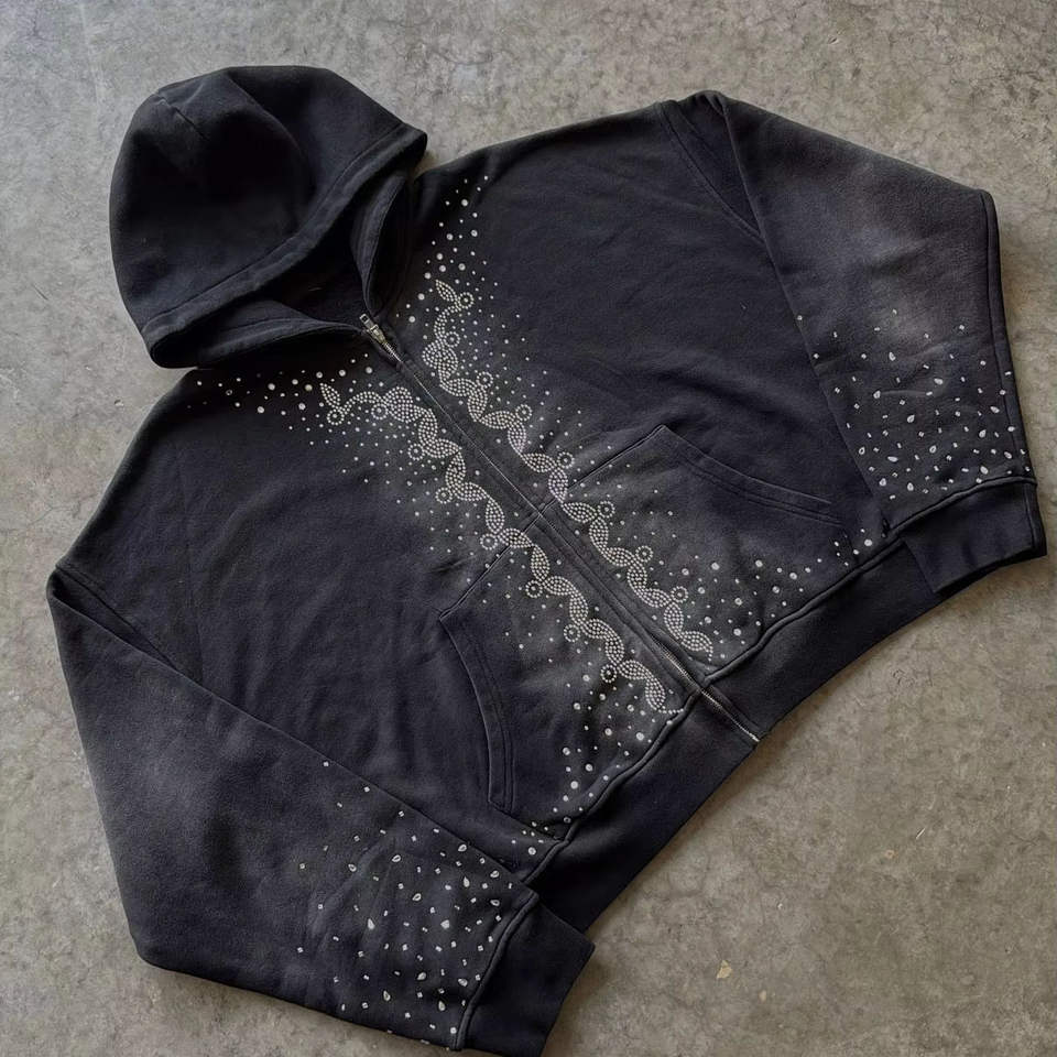 Technics:Embroidered, Printed, Puff Print, acid wash, Rhinestone, Chain embroidery