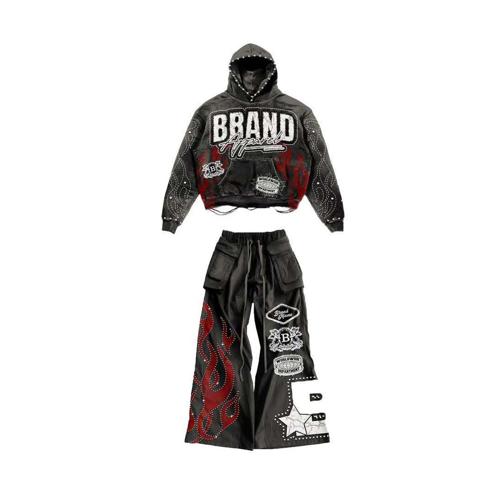 Custom Winter Cropped Vintage Distressed Hem Acid Wash Heavyweight Fleece Screen Printing Rhinestone Cargo Sweatpants Hoodie Set