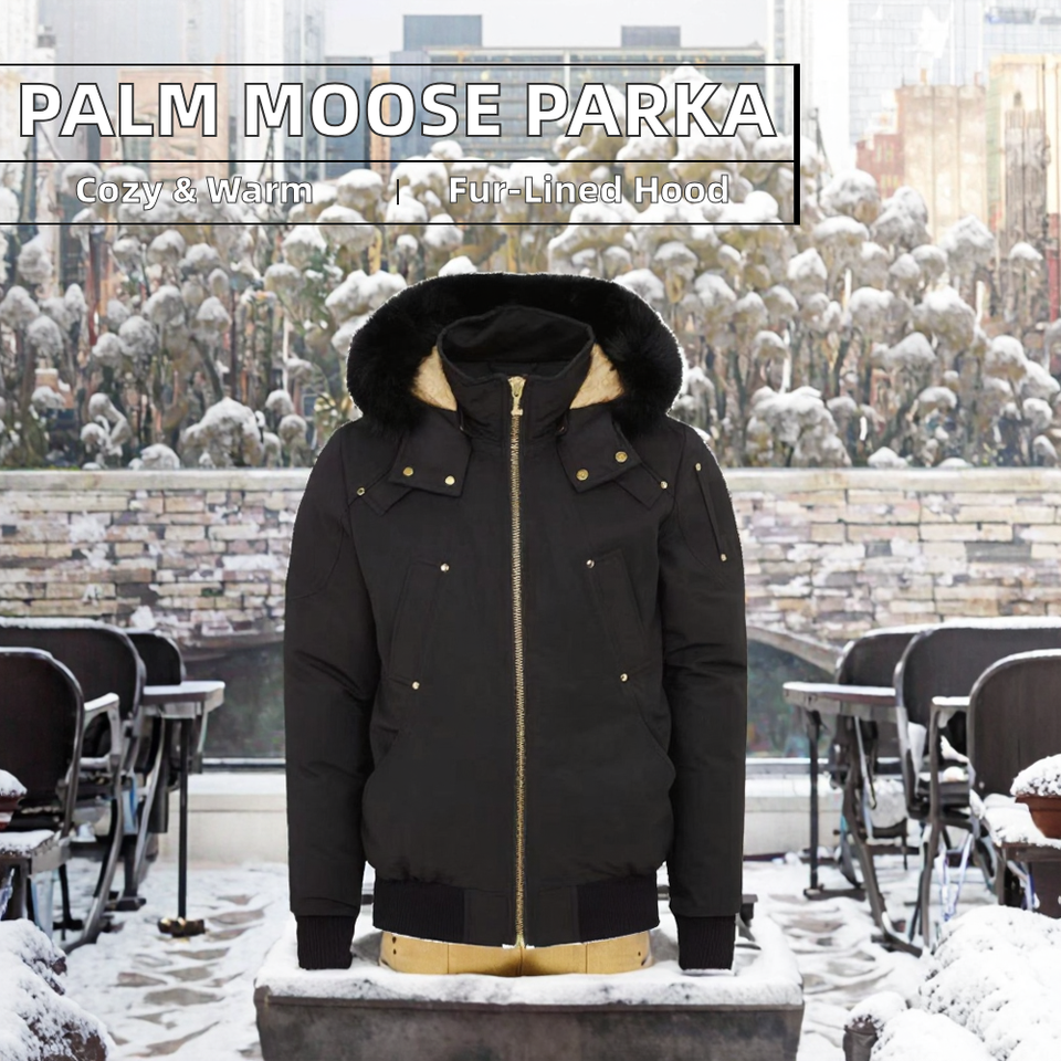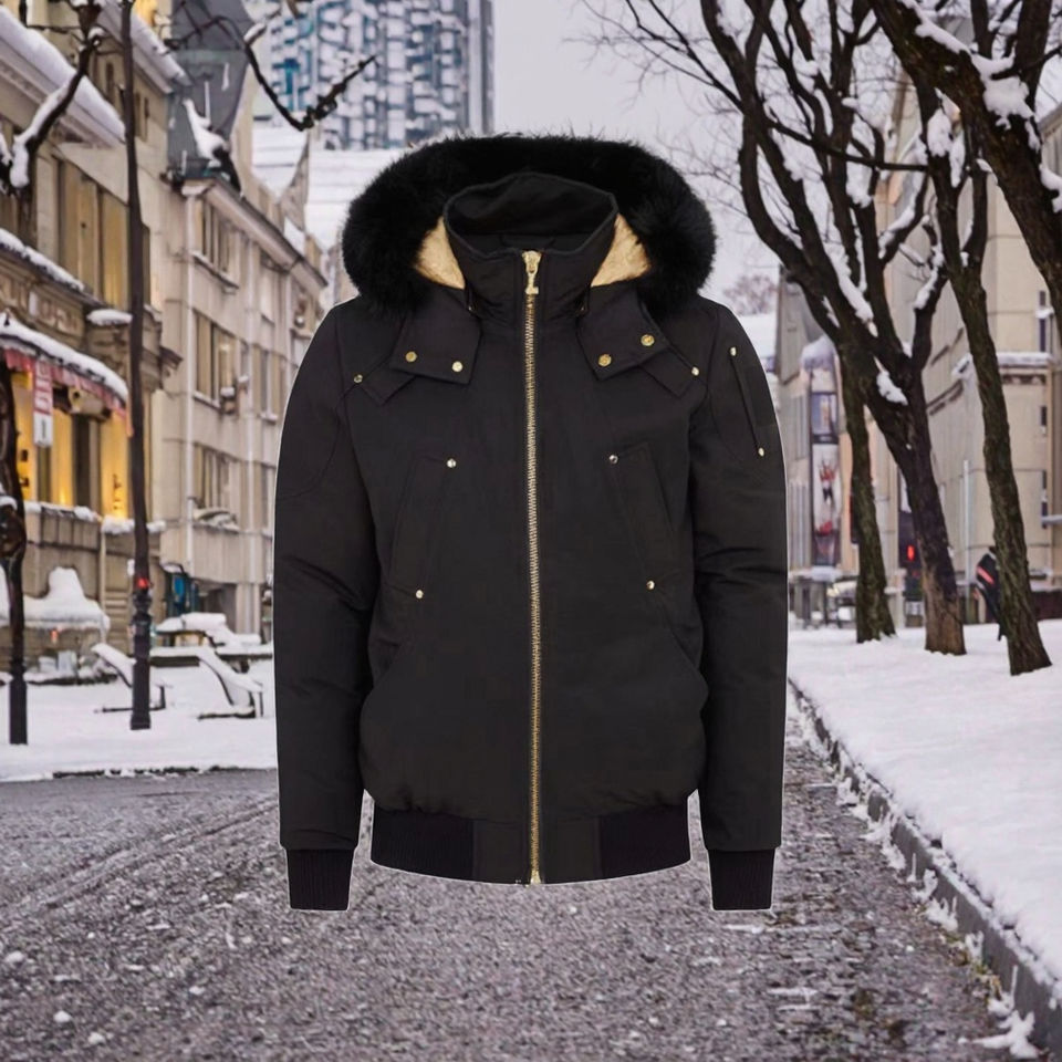 Custom Winter Parka Fox Fur Hood Breathable Black Jacket Featuring Zipper Closure Casual Canvas Fabric Moose Men's Puffer Coat