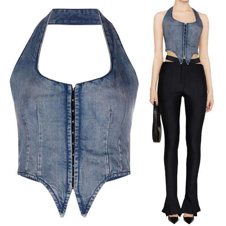 Custom Women Blue Faded Denim Halterneck Vest Round Neck Front Zip Asymmetric Jean Vest Corset Denim Jacket