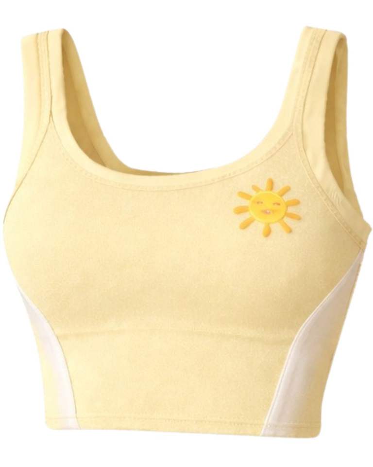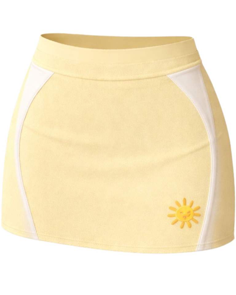 Custom Women Light Yellow Two Piece Crop Top And Mini Skirt Set Sleeveless Scoop Neck Sun Patch High Waist Bodycon Summer Wear