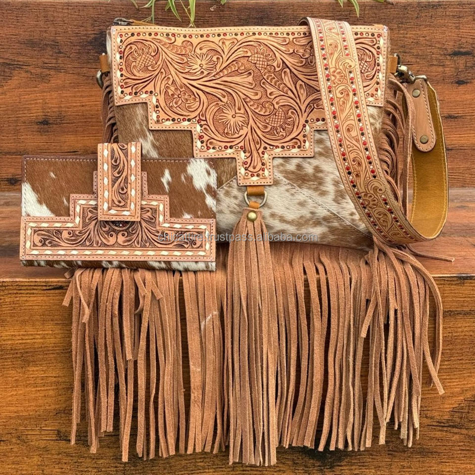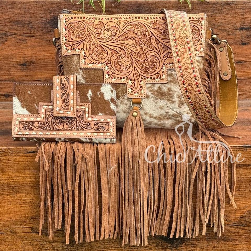Custom Women Luxury Large Hand Tooled Leather Fringe Crossbody Bag & High Quality Hand Tooled Cowhide Bifold Wallet 2 Piece Sets