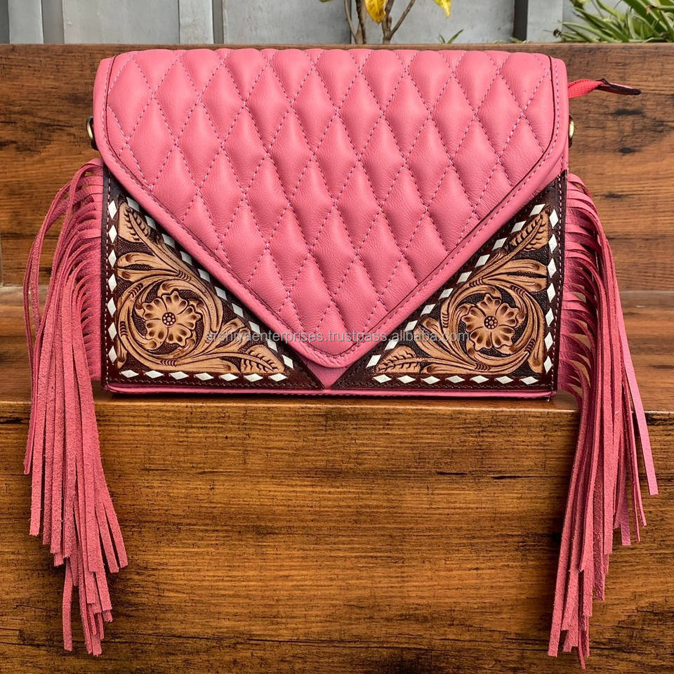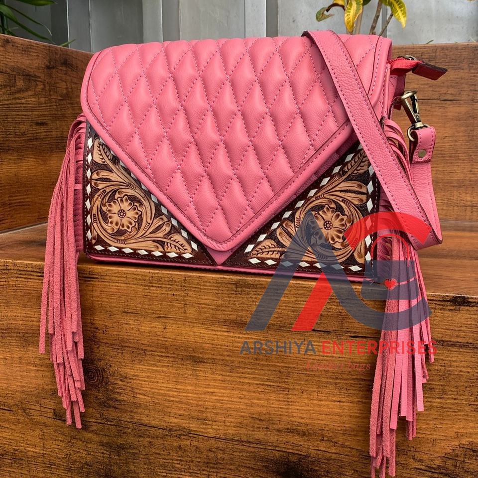 Custom Women Padded Quilted Hand Tooled Leather Fringe Crossbody Flap Bag for Women's Custom Quilted Shoulder Envelope Handbags
