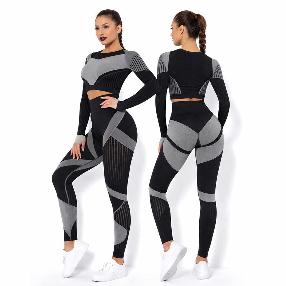 Custom Women Seamless Long Sleeve Crop Top & High Waist Leggings Set Color Block Compression Yoga Gym Workout Activewear