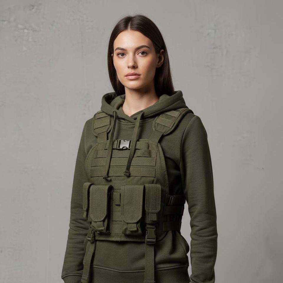 Custom Women Techwear Tracksuit Set Olive Drab Green Multi 3D Pocket Cargo Pants Tactical Vest Detail Hoodie Utility Streetwear