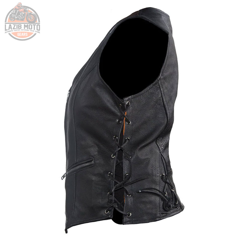 Custom Women's Leather Motorcycle Vest - Sleeveless V-Neck Design with Front Pockets and Durable Stitching for Riding Use