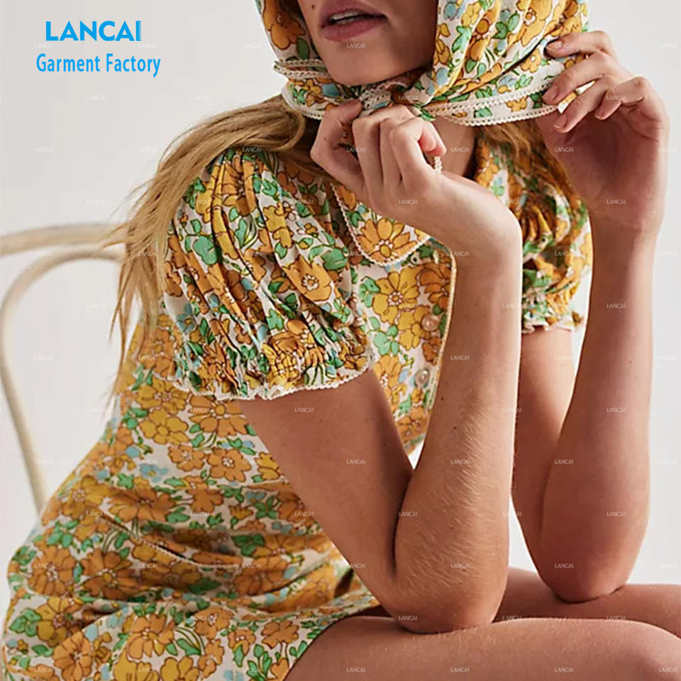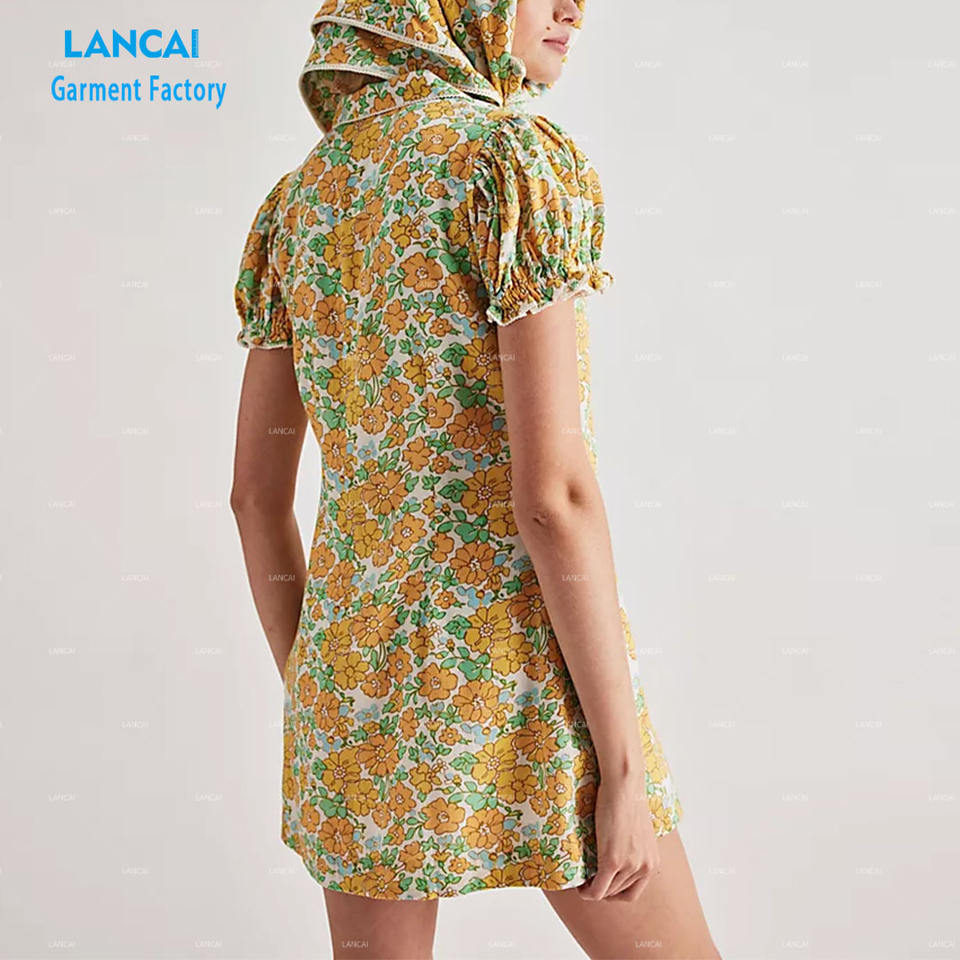 Custom Women's Mini Dress A-Line Silhouette Button-Down Shirt Collar Short Puff Sleeves Coordinating Scarf-Casual Pull-On Style