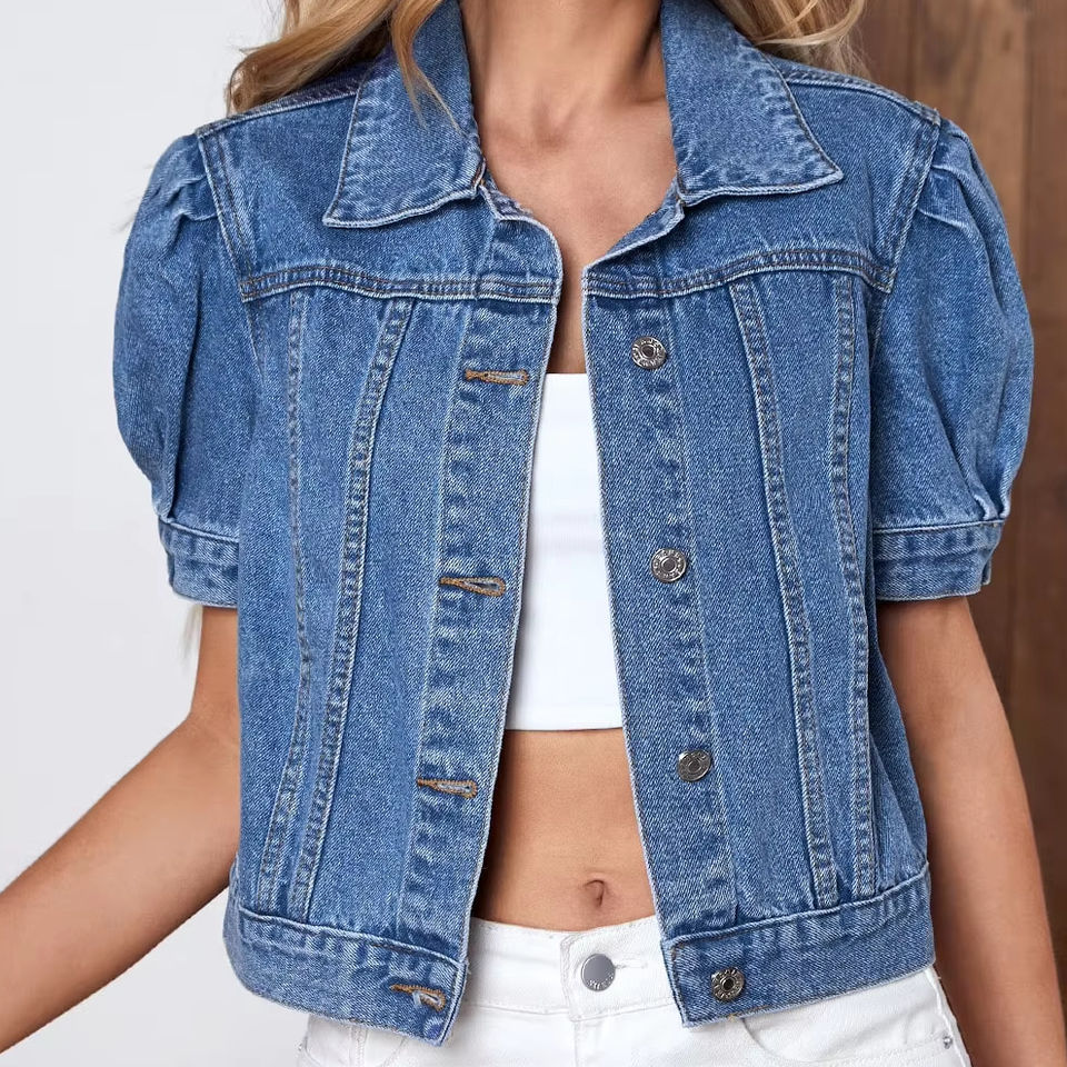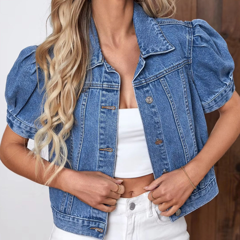 Custom Women's Short Puff Sleeve Denim Jacket Casual Fashion Outerwear for Young Women