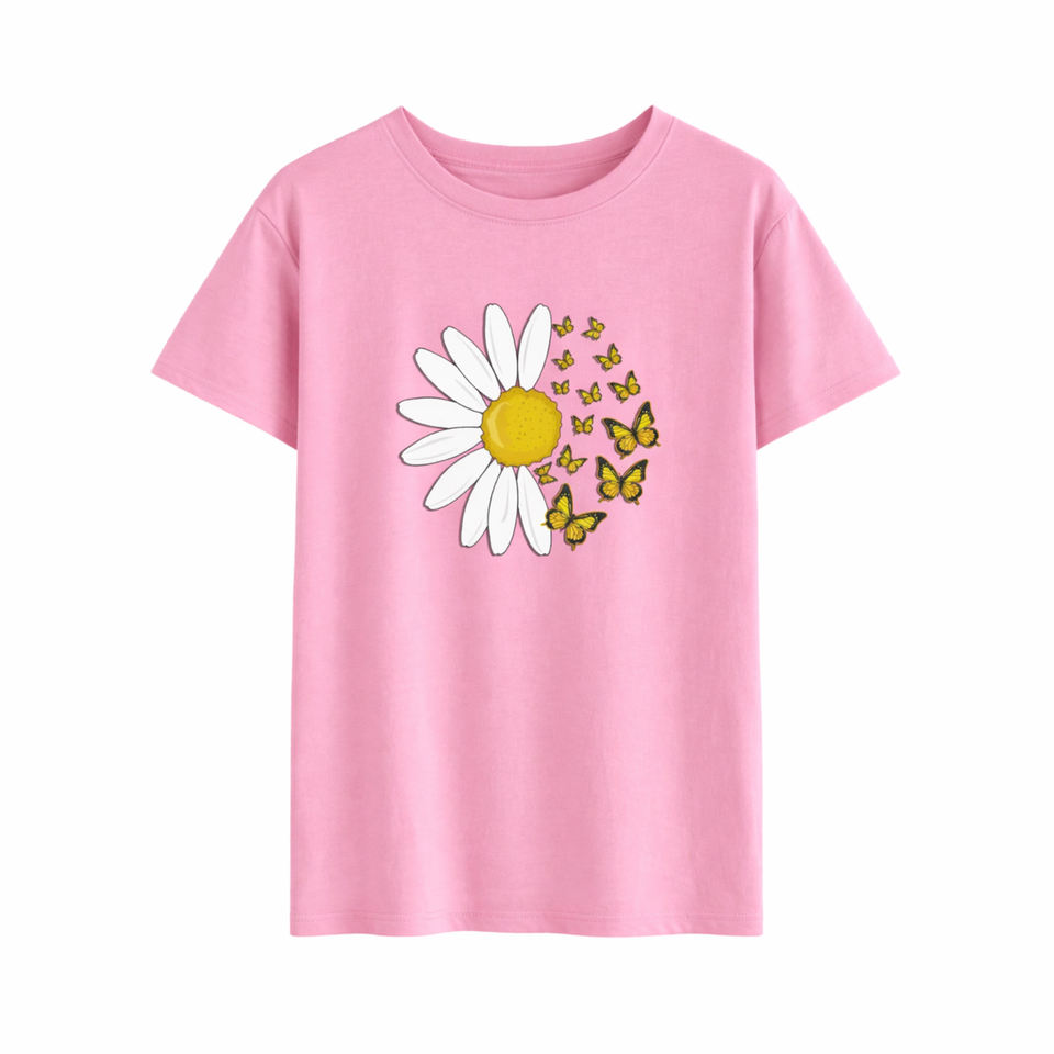 Custom Womens Pink Graphic T-Shirt Daisy Flower & Butterfly Print Casual Cotton Tee