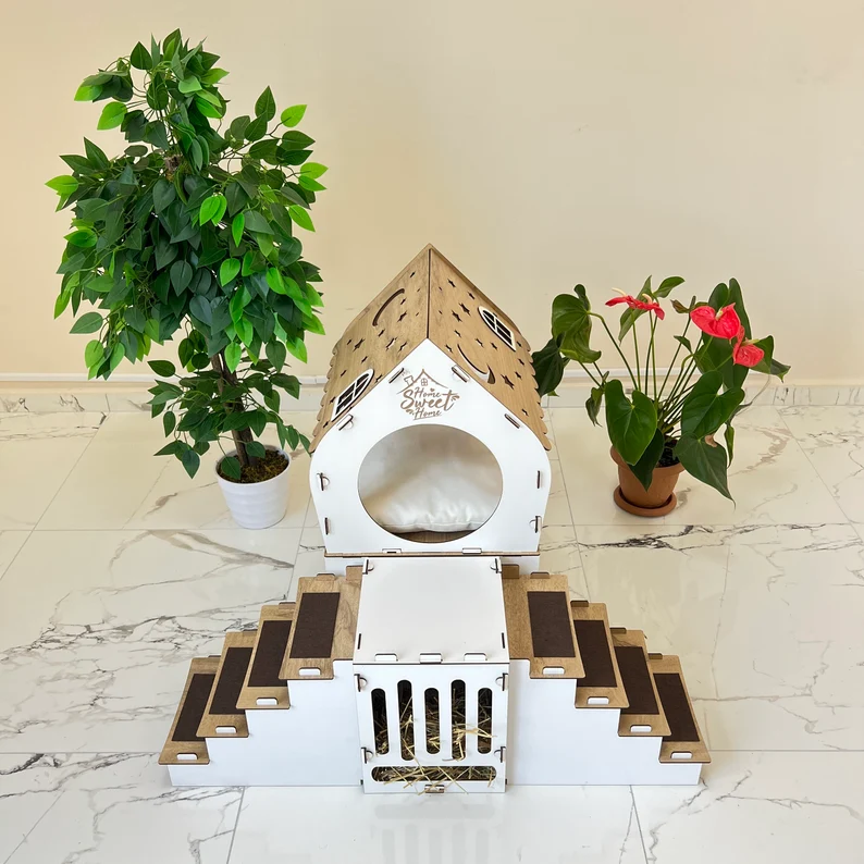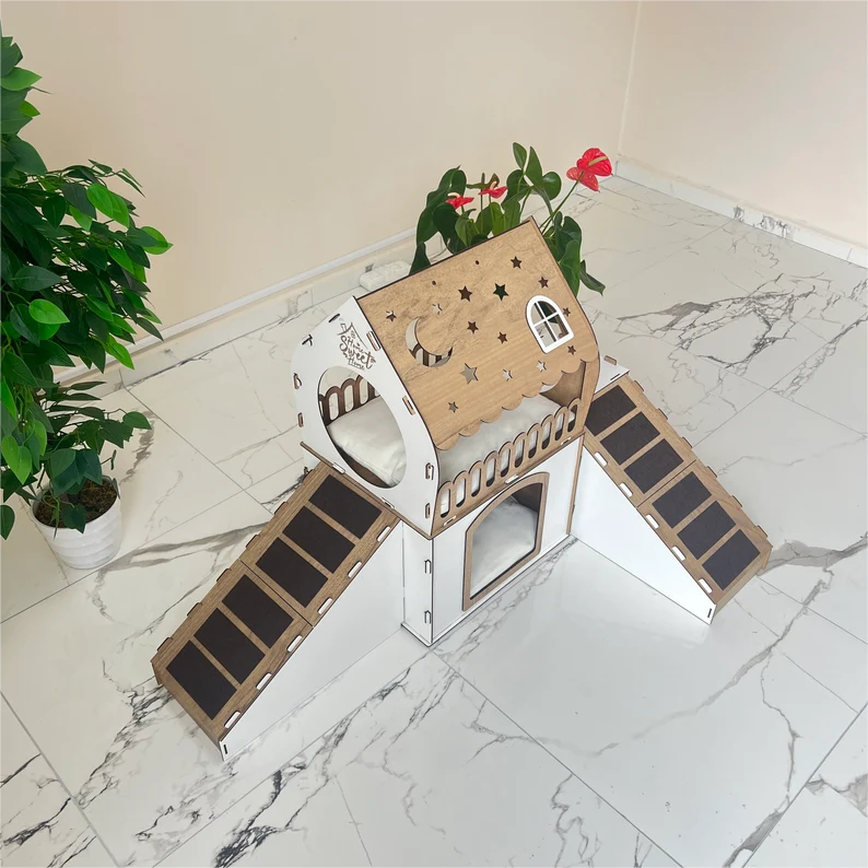 Custom Factory Eco-Friendly Pine Wood Rabbit House Two Storey Tree Hole Pet Castle for Cats