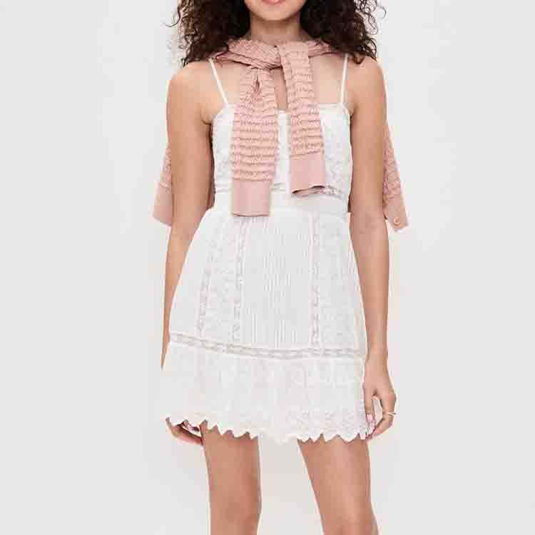 Custom floral embroidery and lace pleated halter mini dress high quality 100% cotton embroidery dress
