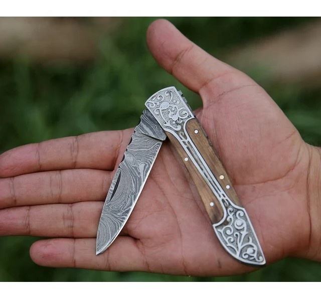 Handmade Custom Stainless Damascus Steel Pocket Knife Rose Wood Handle Fine Leather Sheath Utility Knife Hot Selling Trending