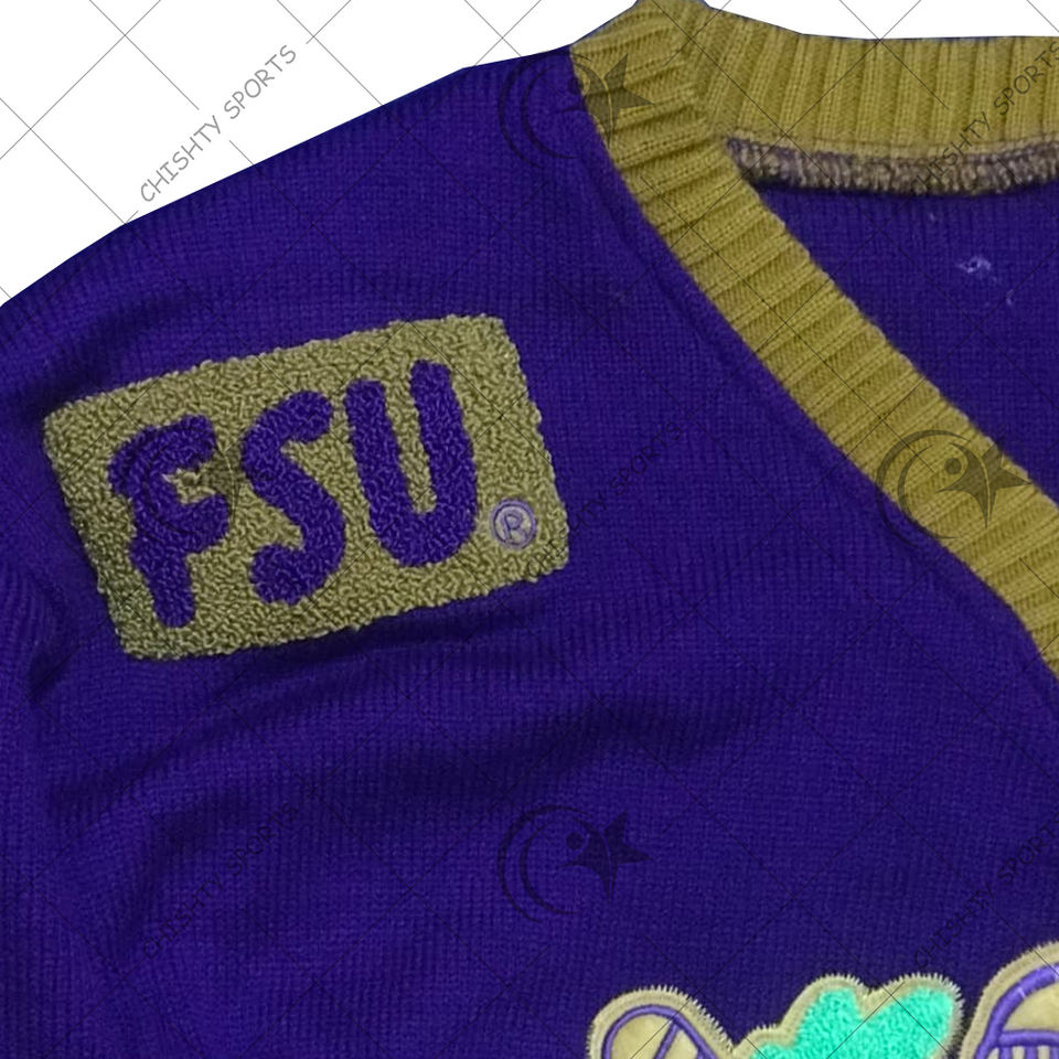Custom heavyweight V-neck cardigan sweater with custom chenille logo patches vintage collegiate varsity knit sweater