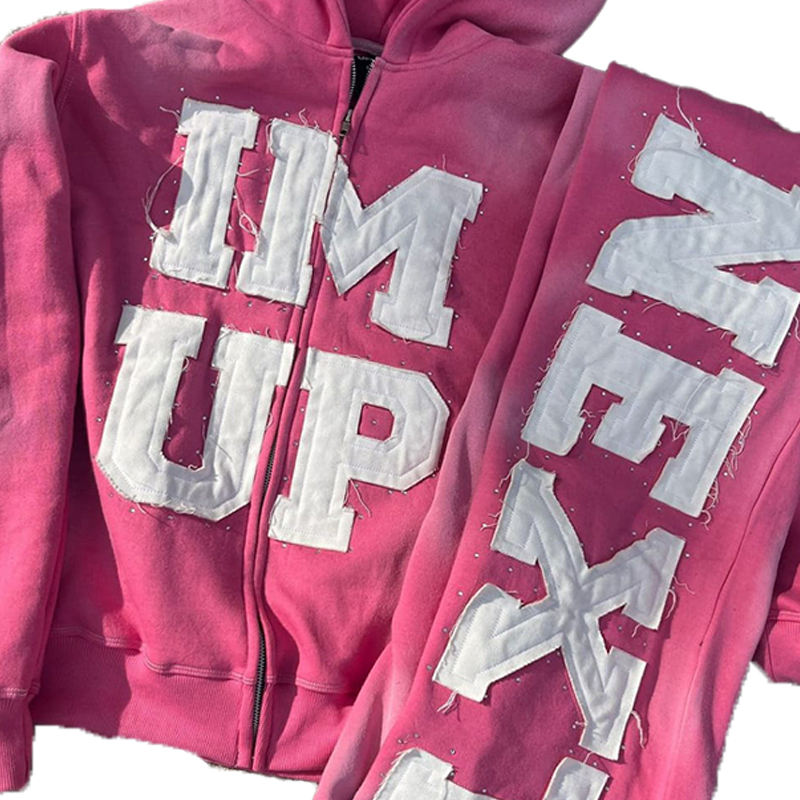Custom Hot Selling Zip up Sweat Suits Distress Patch Acid Wash Hoodie and Sweatpants Set Flared Tracksuit for Men and Women