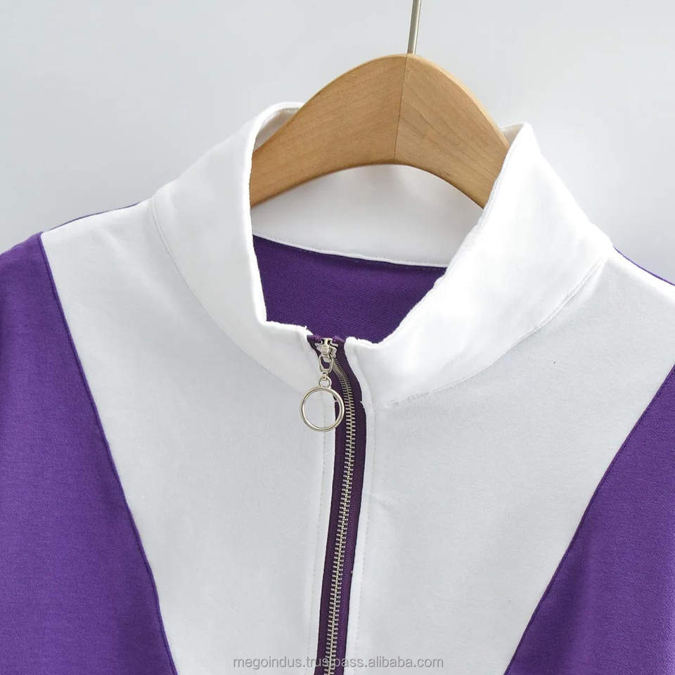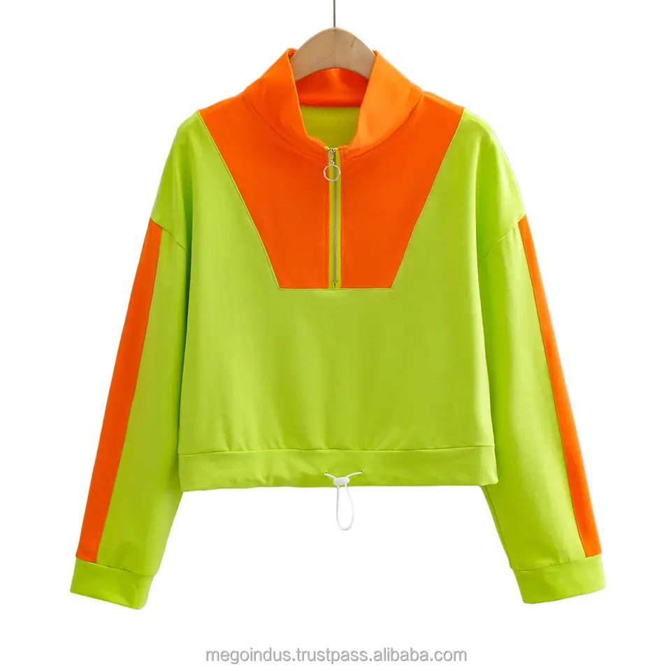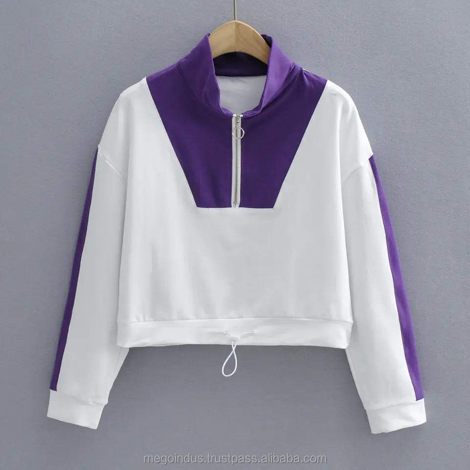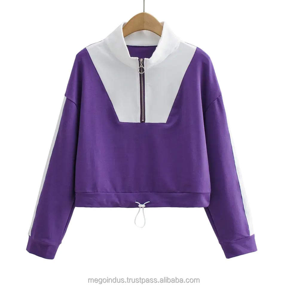 Custom logo 100% Cotton Crop Top Women Patchwork Stand Collar Hoodie Plus Size Half Zip Pullover Short Hoodie