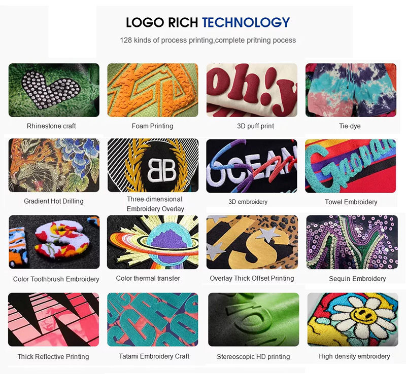 Discharge Printing, Tie-dye, Puff Printing, Embossed, Heat-Transfer Printing, Digital Printing, Silk Screen Printing