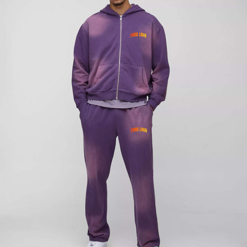 Custom logo Acid Washed Distressed Zip Up Tracksuit Two Piece Sun fade Wash Purple Heavyweight Hoodie & Sweatpants Set