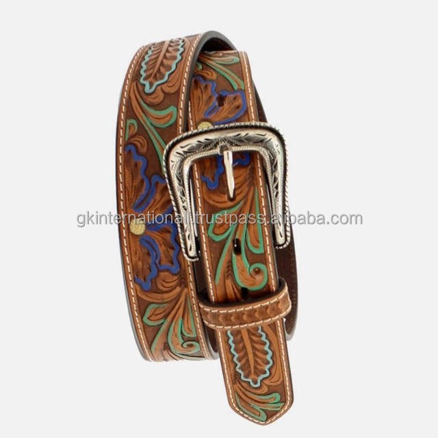 Custom made Colorful Hand Carved Floral Embossed Unisex Pure Western Leather Tooling belt with engraved cowboy buckle