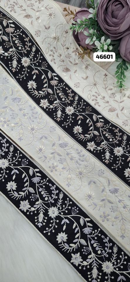 Custom made floral embroidered in black and white base coloured in ethnic designs for various purposes in 2 inch width.