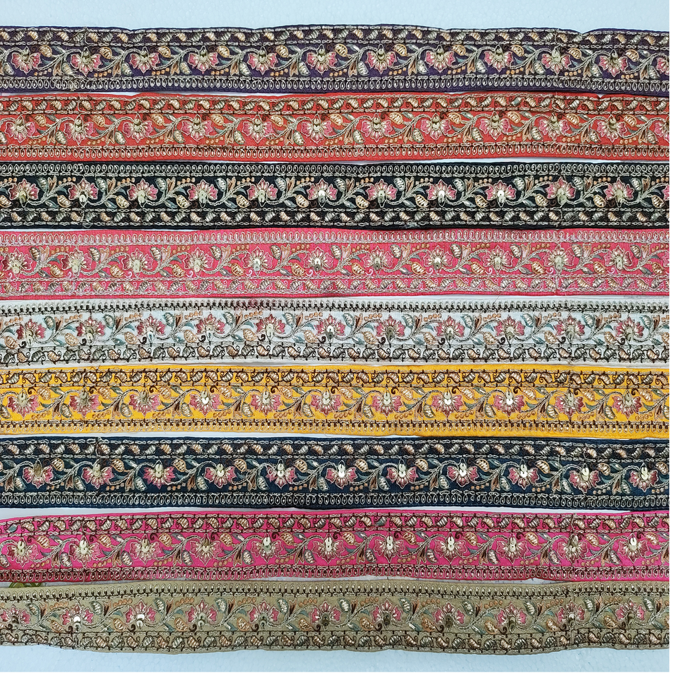 Custom made floral embroidered laces in several colour ways in ethnic designs for various purposes with sequins work for resale