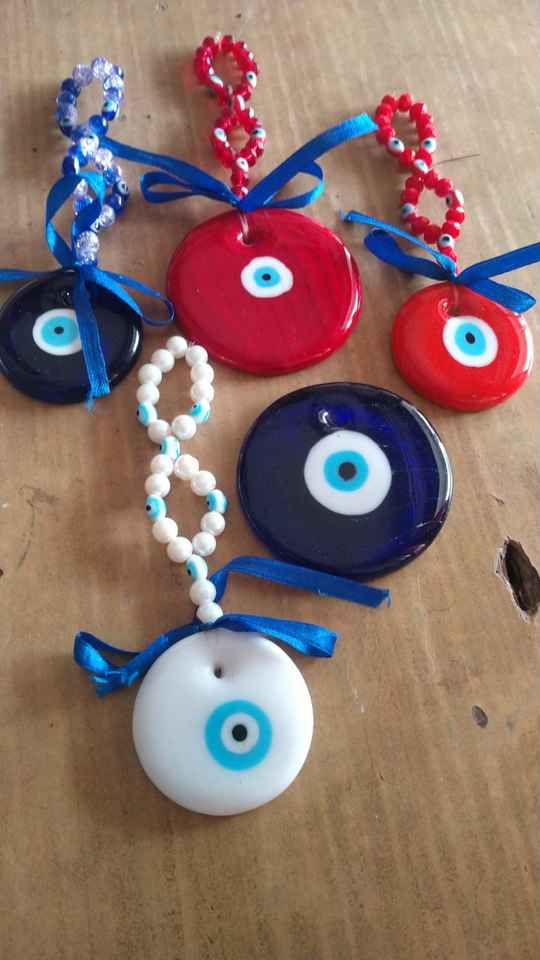 Custom Made Glass Bead in Circular Design Red with Green Beads and Traditional Blue Eye for Home Decoration Jewelry Designers