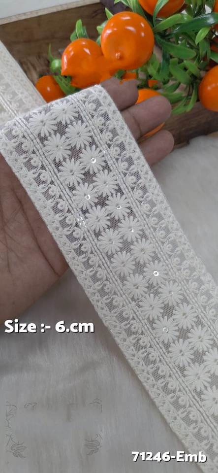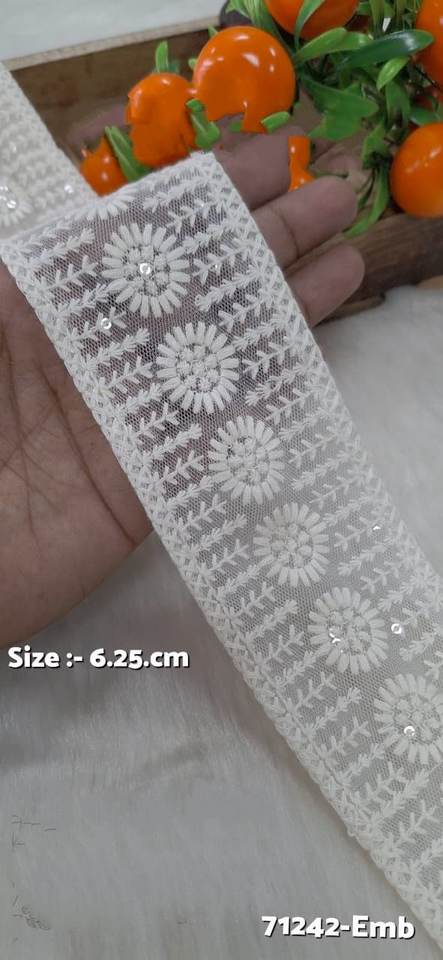 Custom made in 2 inch width white coloured floral embroidered laces on net fabric with straight sequins border design for resale