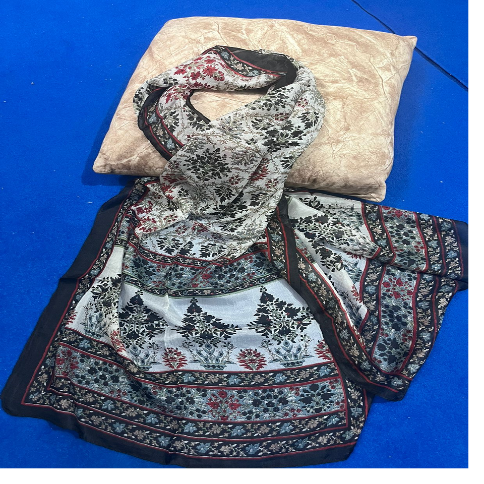 Custom made in white and black coloured printed silk scarves in floral design for girls and ladies of all age group and resale