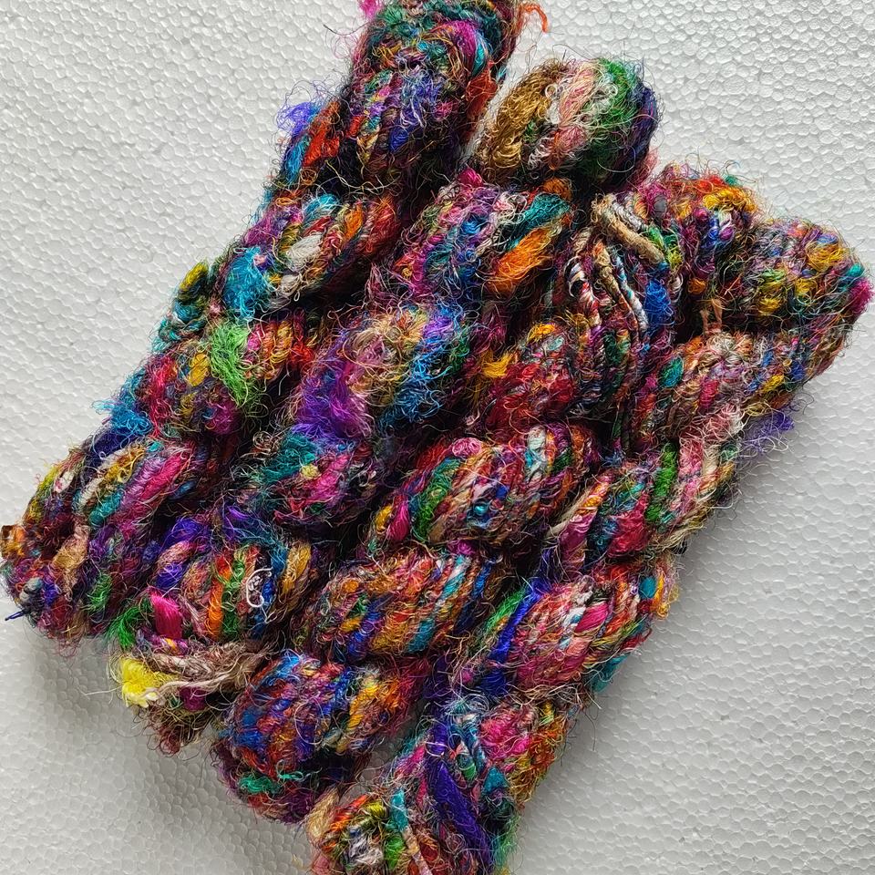 Custom made multicolour sari silk ribbon is crafted from recycled silk saris. Trips of silk are torn, sewn, and hand-dyed.
